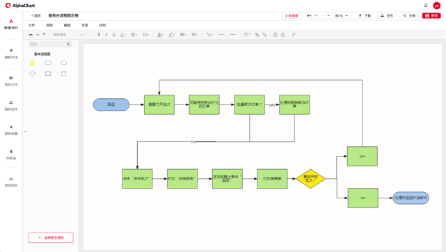 在AlphaChart中每個符號都是矢量的,可以填充顏色,改變大小,定義數據和連接。在流程圖標準符號包括4個基本流程符號橢圓形、矩形、箭頭、菱形和5類中高級的流程圖符號。